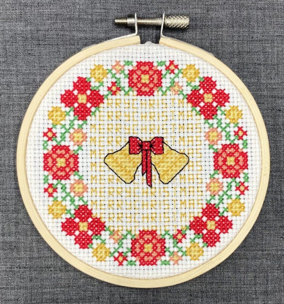 Celebrate the season with these elegant gold Christmas bells, nestled inside a ruby, gold and pink wreath for a rich, traditional look. The golden Merry Christmas backstitch adds a warm finishing touch. Stitched on 14 count aida, the completed design measures 3.5 x 3.5 inches, and the model in the photos was finished in a 4‑inch hoop, ready to hang, gift or turn into a festive card.