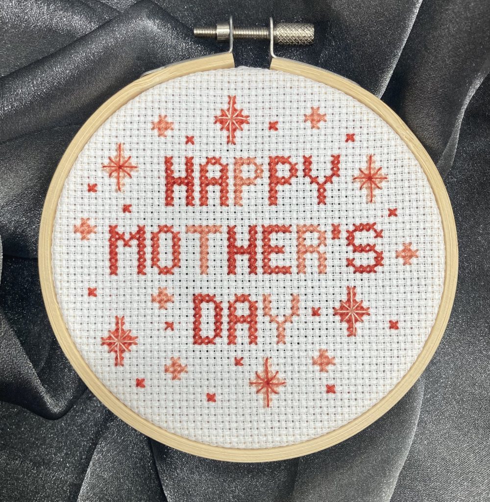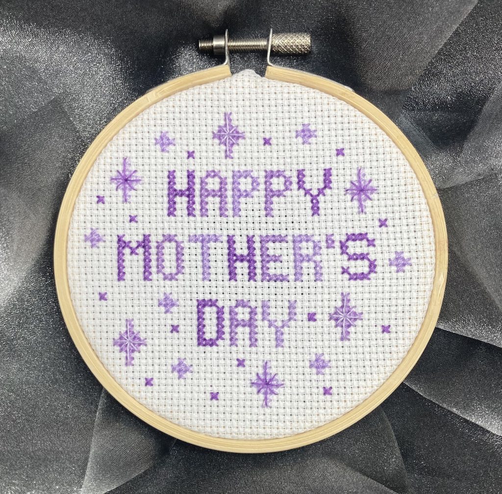 Celebrate Mother’s Day with this Happy Mother’s Day Cross Stitch Pattern, perfect for creating a handmade card or a beautiful stitched keepsake. This counted cross stitch design features elegant pink tones with delicate star details and can be completed in just a few hours — ideal for last‑minute gifting or a relaxing weekend project. The finished design measures 3.5 x 3.5 inches on 14 count aida. The stitched example shown in the photo above is displayed in a 4-inch embroidery hoop.