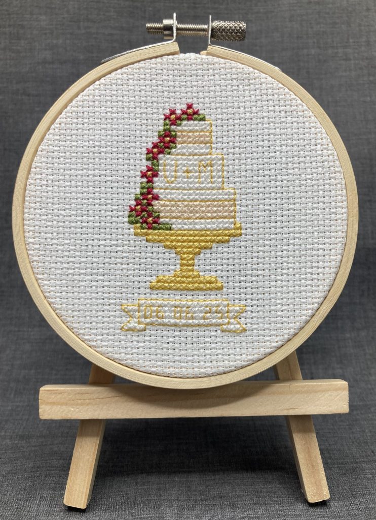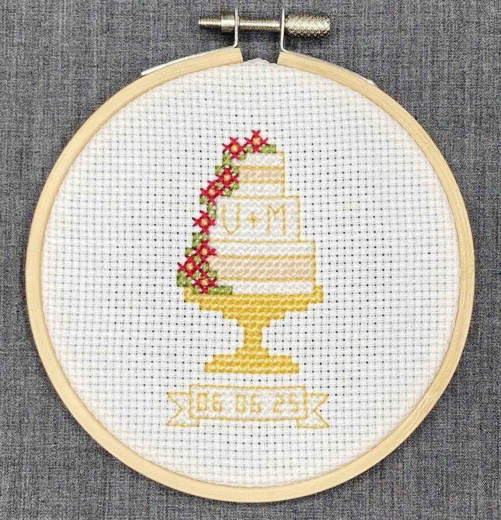 A white wedding cake cross stitch card or hoop, personalised with the happy couple’s initials and date of the big day. Complete with a gold cake stand, peach ribbon and beautiful red flowers highlighted in backstitch, this design would also make a thoughtful anniversary gift.